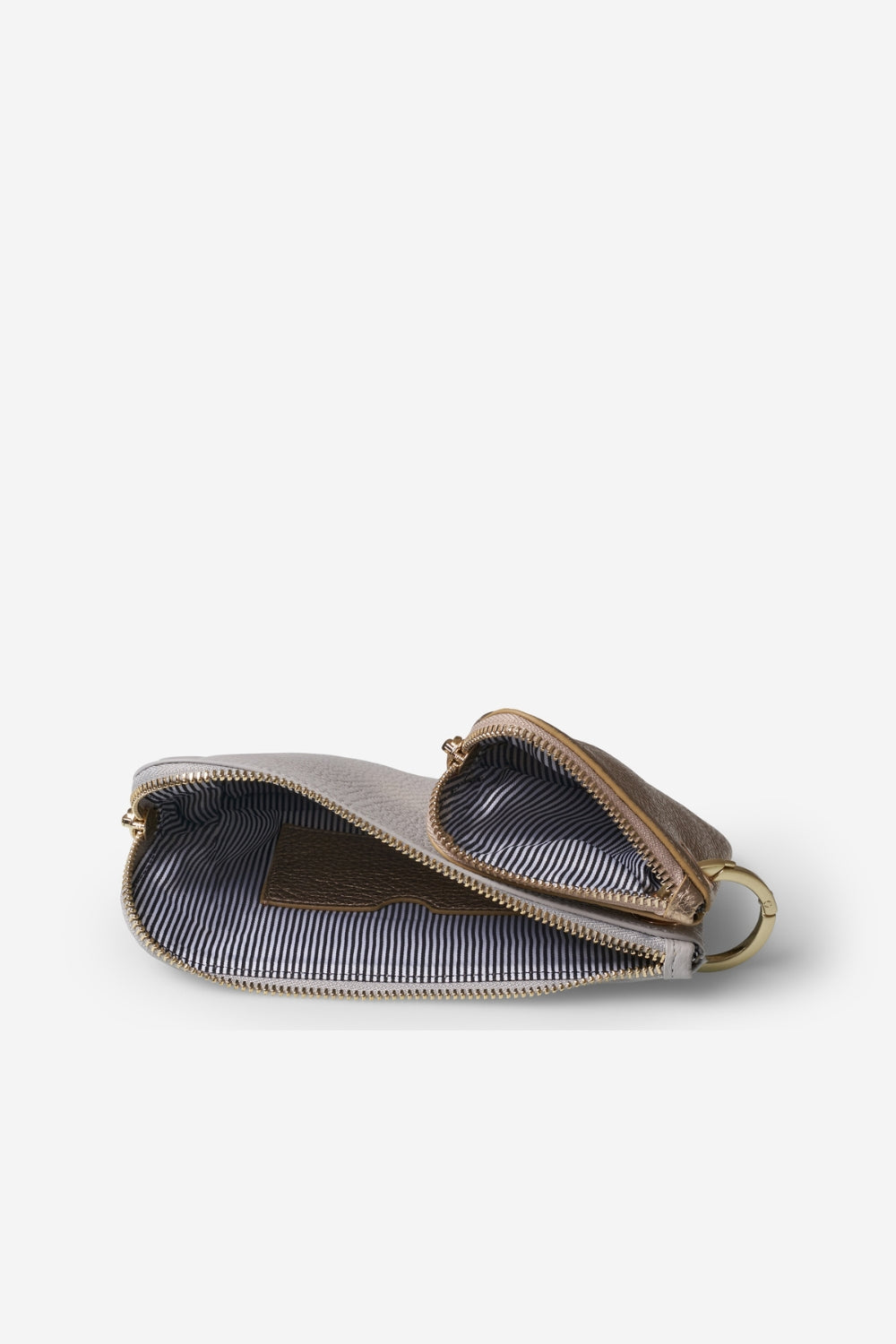 - Two contrasting YKK zippered pockets and leather wrist strap for easy carry