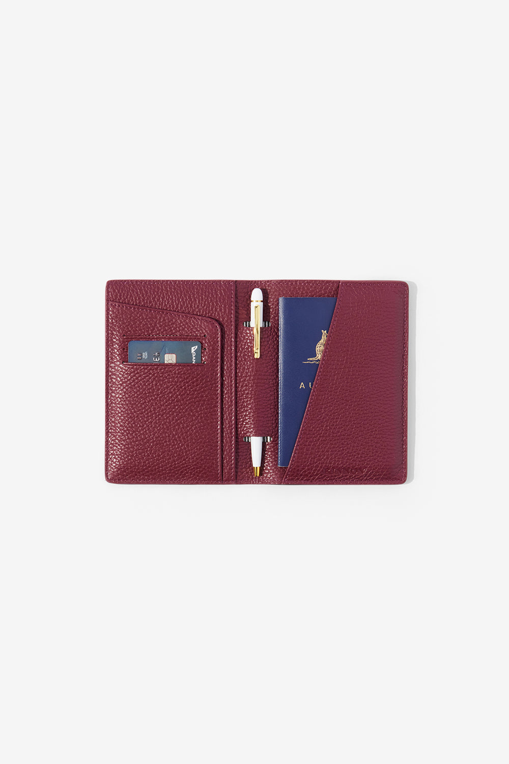 Available in a range of colours in Italian pebble leather, Kinnon's passport holder is compact and functional with space for international travel essentials.