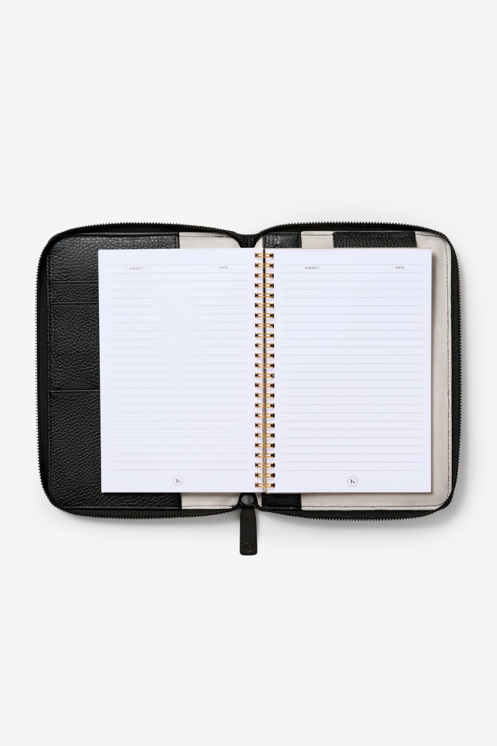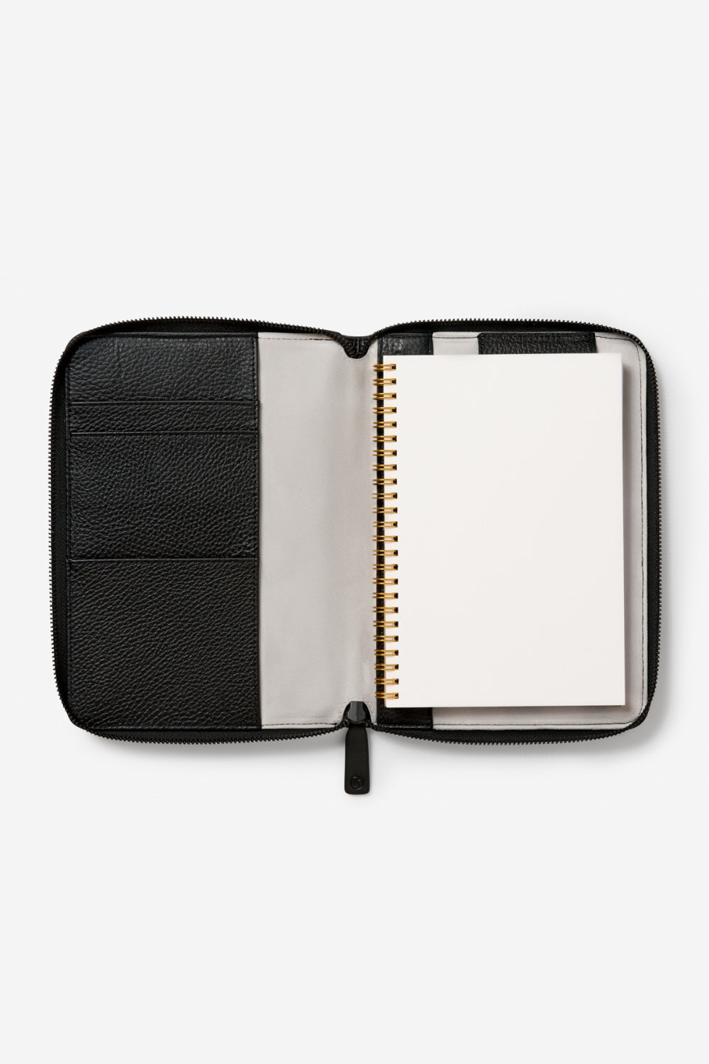 The perfect place for all your big ideas. The Harley features four internal pockets for cards and notes, a pen holder, an A5 spiral notebook, and a zippered rear pocket for extra storage. Compactly designed with a secure exteral zipper and made from sustainably sourced and certified Italian pebble leather.