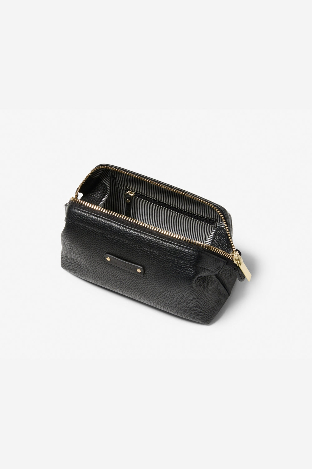 Our Sylvie beauty bag in beautiful pebble leather will become an everyday and travel essential for make-up, smaller cosmetics, and brushes. Made from beautiful black pebble leather with a monochrome striped water-resistant lining which can be wiped down to clean, the doctor's bag style opening allows easy access and full visibility of contents.