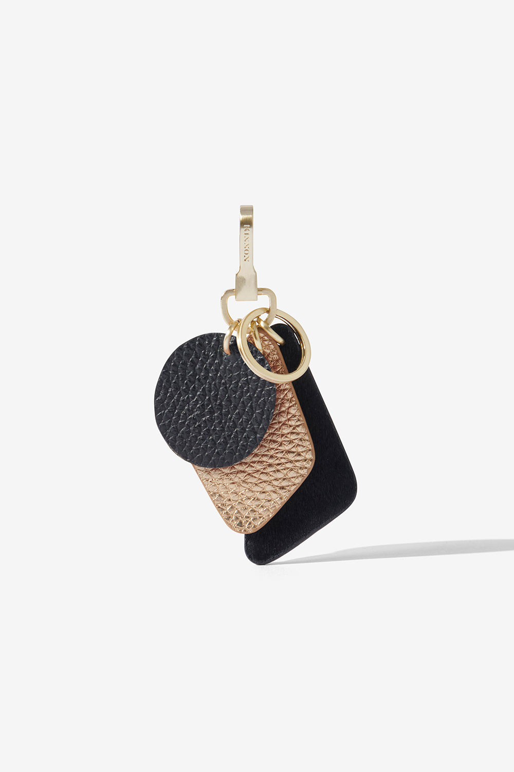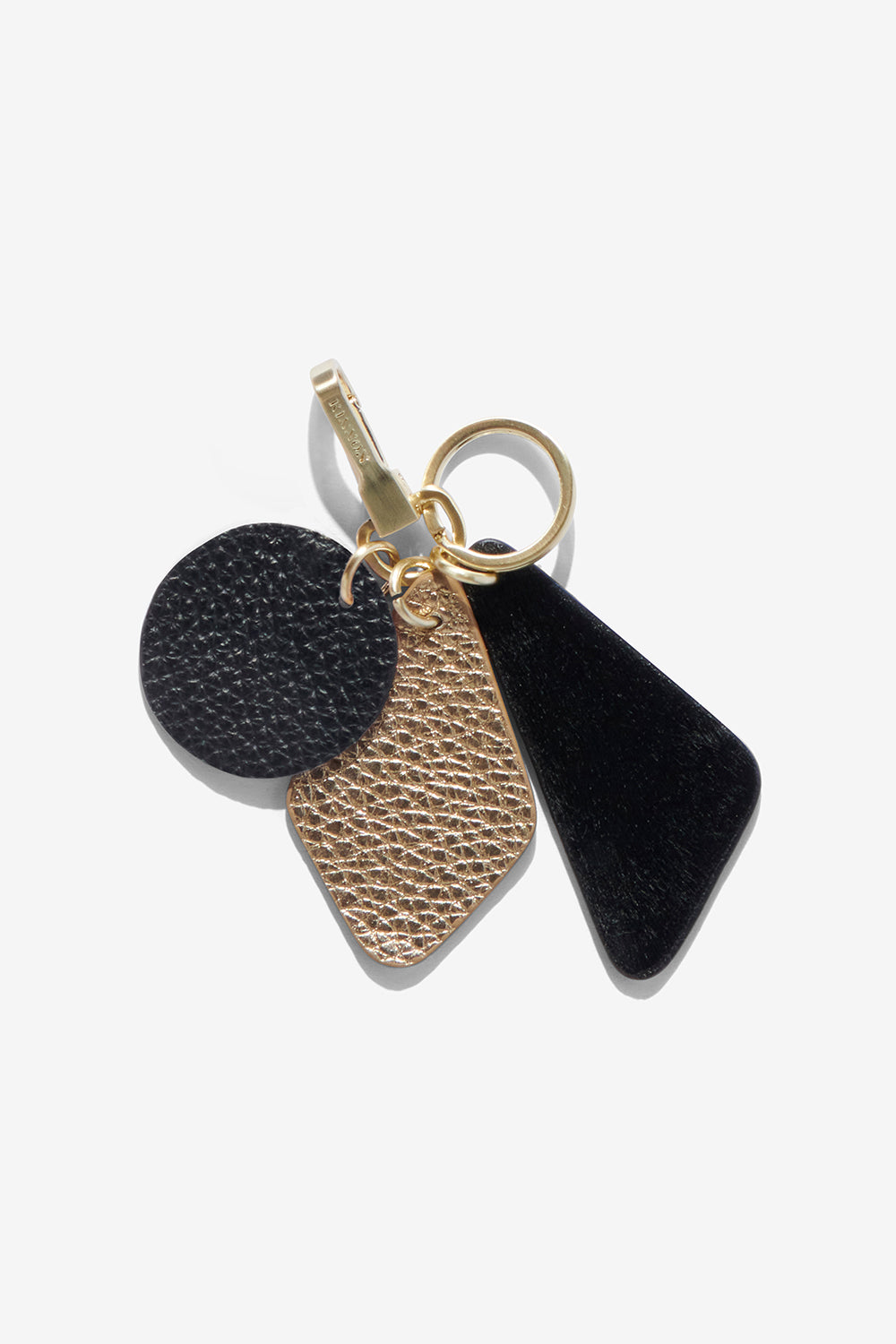 Add a little luxe and personality to your keys or bag with the Ava keyring. Featuring light brushed gold hardware, and three leather flags with hand-painted edges. The circular and diamond flags are made from Italian pebble leather, and the rear triangular flag is made from faux pony fur leather.