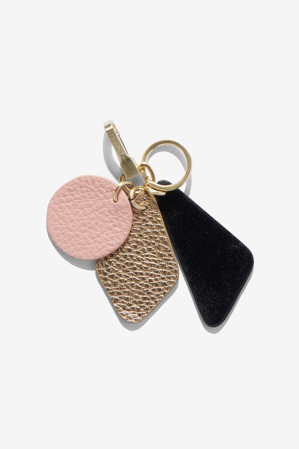 Add a little luxe and personality to your keys or bag with the Ava keyring. Featuring light brushed gold hardware, and three leather flags with hand-painted edges. The circular and diamond flags are made from Italian pebble leather, and the rear triangular flag is made from faux pony fur leather.