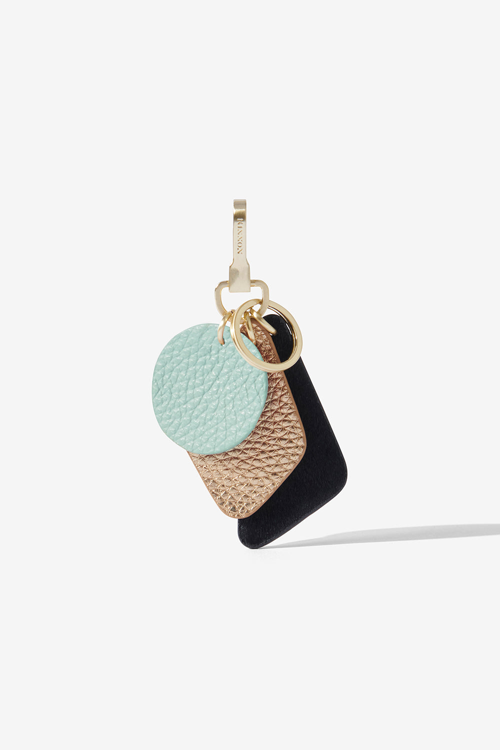 Add a little luxe and personality to your keys or bag with the Ava keyring. Featuring light brushed gold hardware, and three leather flags with hand-painted edges. The circular and diamond flags are made from pebble leather, and the rear triangular flag is made from faux pony fur leather.