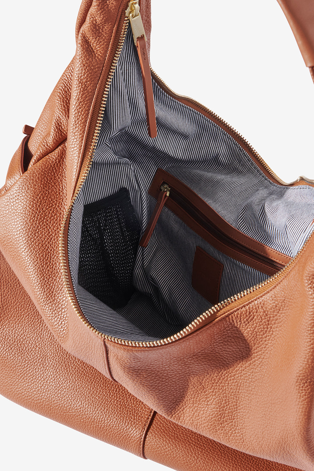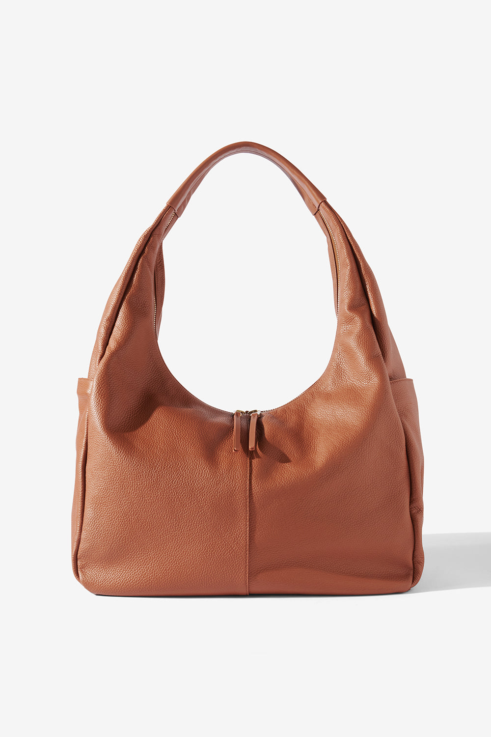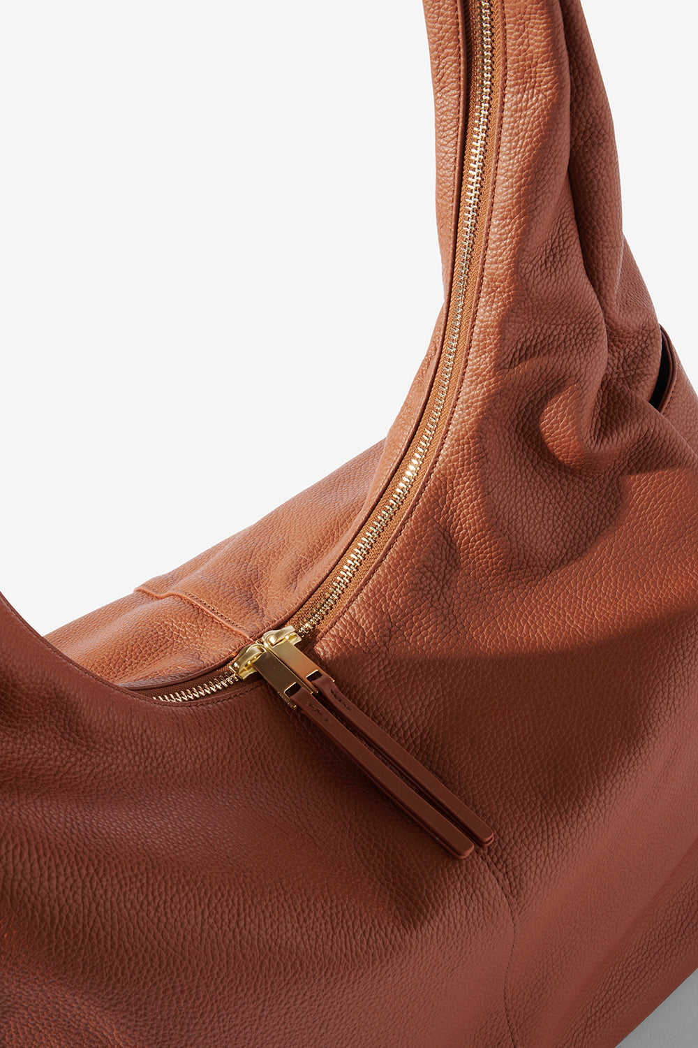 - Sustainably sourced Italian pebble leather with nappa leather handle contrast