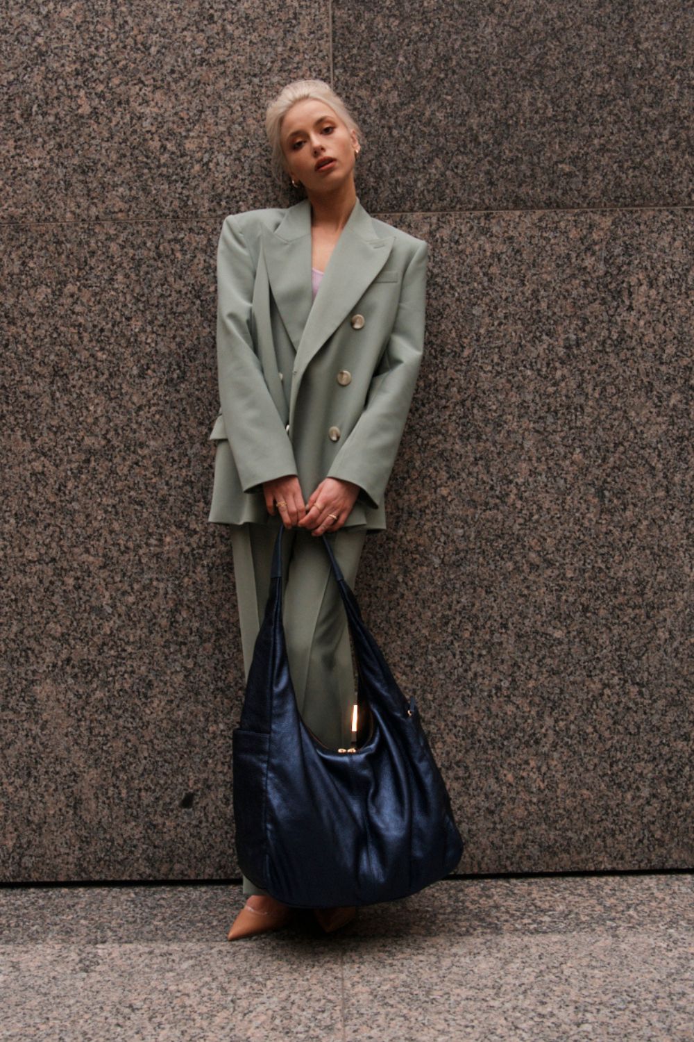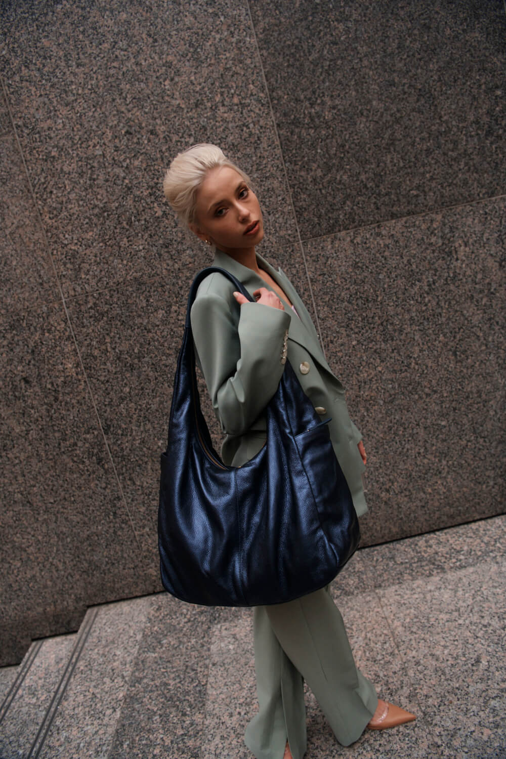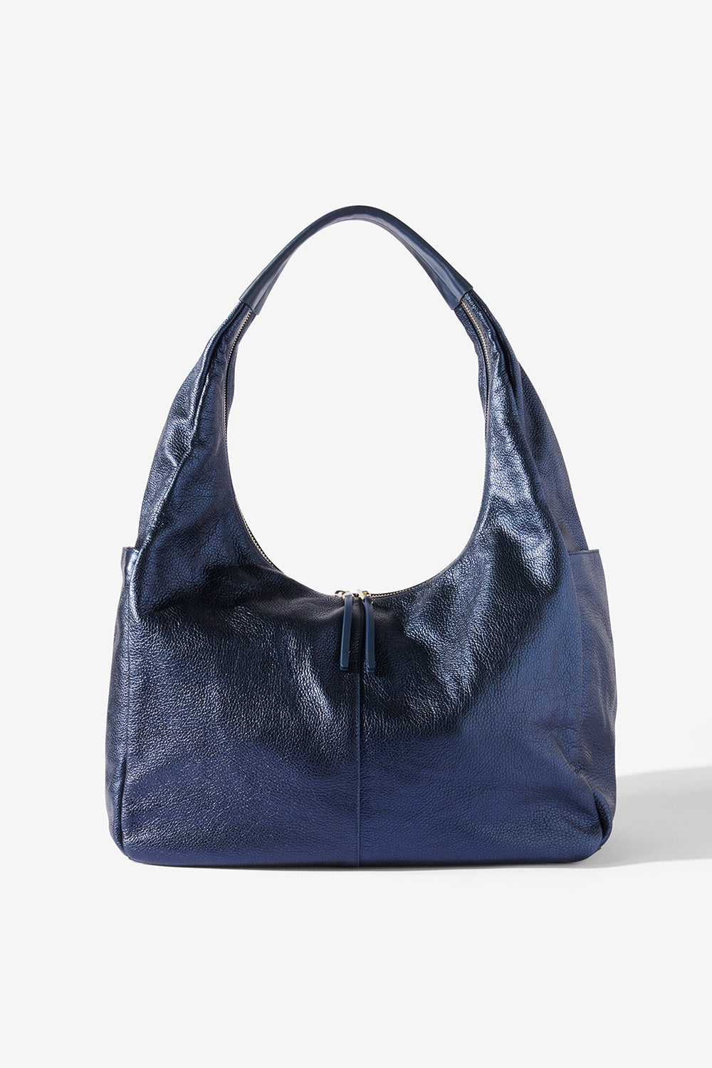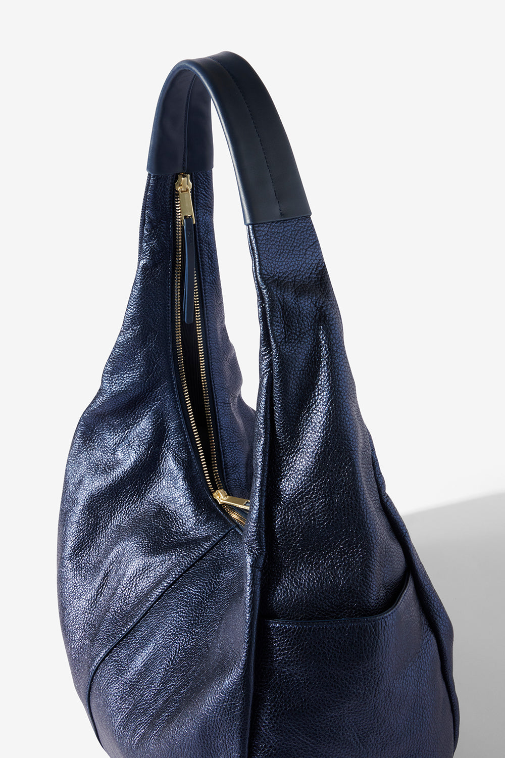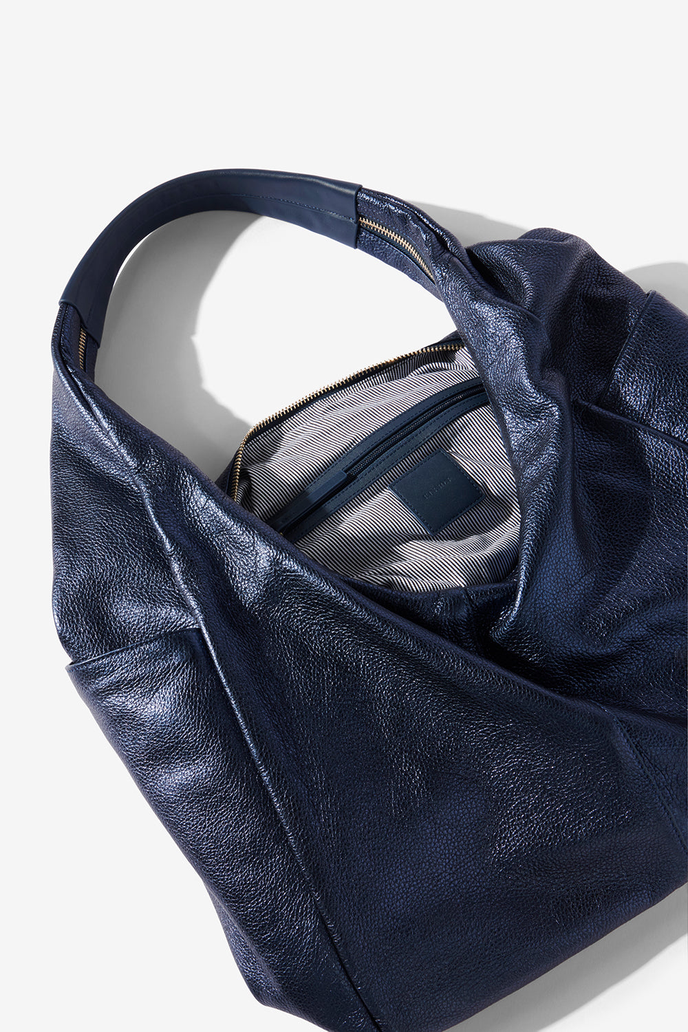 Our iconic Amelia is striking in metallic navy. This stunning on-trend colour is powerful and edgy, and works across summer and winter ensembles.