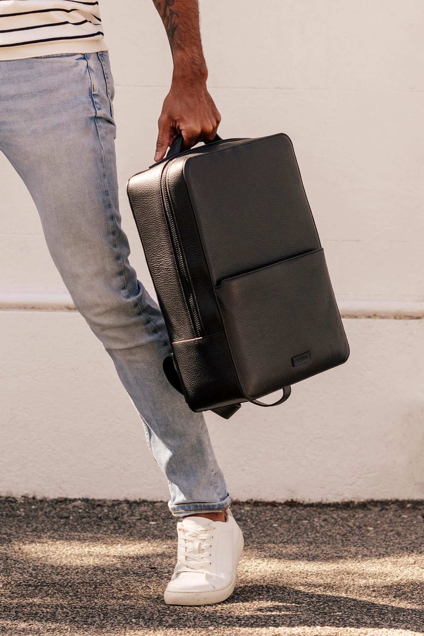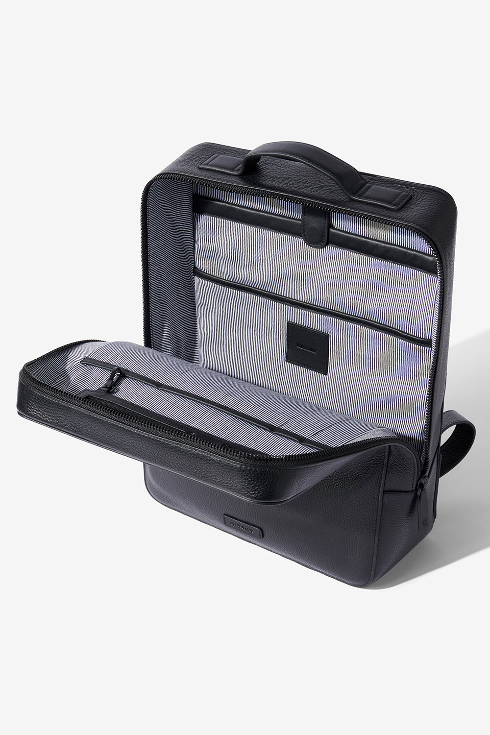 The Magellan's clever construction delivers a compact and streamlined carry, with dedicated spaces for all the essentials, including a laptop, compendium and waterbottle. The wide zip opening allows for ease of access; adjustable and padded shoulder straps ensure maximum comfort and the rear suitcase slide makes it a travel essential. Built to last and made from Italian pebble leather with nappa leather contrast detailing and a monochrome striped lining.